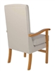 The Jubilee High Back Chair, a classic and economical high seat chair with removable seat cushion, wooden arms, high back and front cross bar. The chairs are suitable for use domestic use, in the nursing home or care home and ideal in other healthcare environments such as hospital ward rooms, day care, hospices and housing associations. It is a stock chair with a 5-10 working day delivery from order for single chair orders only and if more than one is required contact the office and additional delivery charges will apply and available in an anti-microbial vinyl covering C&L Bronx Putty Vinyl. For Cleaning and Care please call the office for details. The chair frame comes in a lacquered oak wood finish.